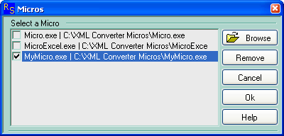 If you have a task to create an extraordinary XML from you data source, using the Micros feature can save countless hours of work. If you have need of a specially structured XML output and you want to perform a conversion task repeatedly in RS XML Converter, you can automate the task with a micro. A micro is any executable (.exe) program which contents a series of commands and functions that are stored on your hard drive and can be run whenever you need to perform the task. |