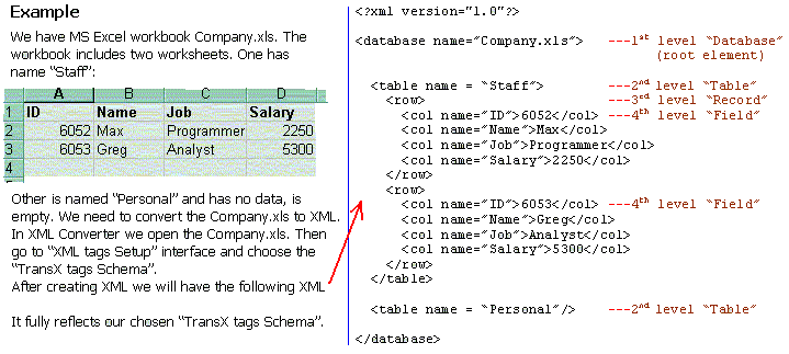 structured Excel data source by using the Converter? Our example is based on shown above Excel spreadsheet and its final XML output. Please follow the several steps: |