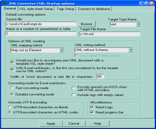 You can put all of command-line arguments to the special configuration file "default.cfg". This file has a following definition rule: ARGUMENT = VALUE List of all arguments: SourceFileName (-s option in command string) - A Name of Data Source file with full path (Example: SourceFileName=D:\Books\CarsExmpl.xls ) SourceTblName_Num (-n option in command string) - Name or a number of spreadsheet or table, which belongs to your Data Source file (Example1: SourceTblName_Num=Sheet number one ) (Example2: SourceTblName_Num=2 ) TargetTypeName (-g option in command string) - A Name of Data Target Type. Values: dtd, xsd, Xml (Example: TargetTypeName=xml ) TargetFileName (-t option in command string) - A Name of Data Target file with full path (Example: TargetFileName=C:/MyDirectory/MyBook.xml) MappingMethod (-m option in command string) - Values: e - Map out as Element, a - Map out as Attribute, r - Map out as Row Content (Example: MappingMethod=E) WritingMethod (-w option in command string) - WritingMethod. Values: ns - XML without Schema , ws - XML with Schema, dg - XML in DiffGram format, tx - XML with TransX Schema (for Oracle TransX Utility) (Example: WritingMethod=NS) NeedXSLtemplate (-l option in command string) - Values: yes, no (Example: NeedXSLtemplate=yes) NeedXLSheader (-h option in command string) - Values: yes, no (Example: NeedXLSheader=no) The following arguments can be definited at default.cfg file only: FastXls - Fast converting mode for Excel workbooks. Values: yes, no. If you have chosen Yes MS Excel sheets will be transformed much faster. But this way is good if you have homogeneous data for each excel sheet column. If you have deferent data types in one column (numbers, date or text) please use No value. (Example: FastXls=YES) WordWdth - Width of Word document or text file in characters (Example: WordWdth=80) NeedLogo - If you run XML Converter with empty command string and NeedLogo=YES you will see the short information about this program. Values: yes, no. (Example: NeedLogo=NO) NeedProgresBar - If you do not want to see a progres bar please define the argument as NO. Values: yes, no. (Example: NeedProgresBar=NO) EncodeLow - Some XML parsers need low ASCII symbols be encoded in HTML presentation. For example, ' char (apostrophe) in an XML content should have the view: ' Values: yes, no. (Example: EncodeLow=NO) Within the default.cfg file you may begin your comments with ' or " as a first symbol of string. Example: " Width of Word document or text file in characters WordWdth=120 If you define arguments in command-line then their values will have a high priority than the values have been defined in default.cfg. In other words, if you have in default.cfg a string: SourceFileName=D:\Books\Book1.xls And then you insert to command-line: -sD:\Books\Book2.xls For this case XMLConverterCmd.exe will convert Book2.xls file, which you have put to command-line. |